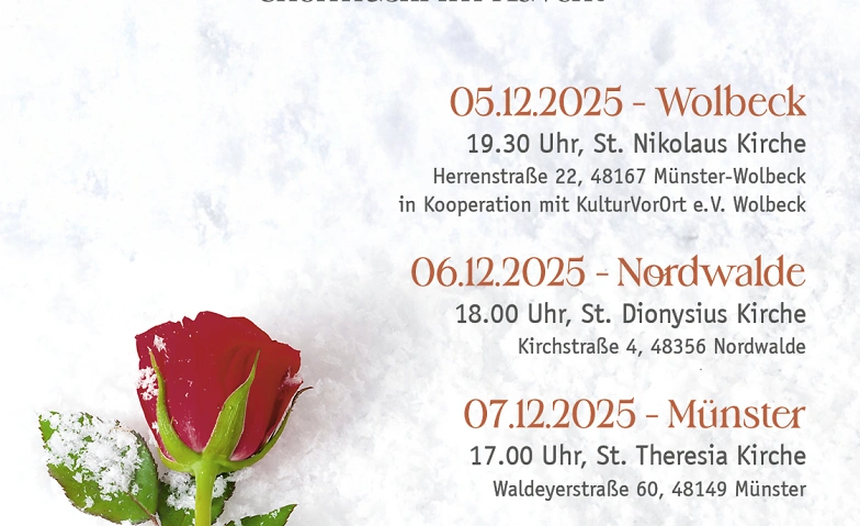 Suchen Filter: Events in welche Morgen Heute in Diverses Essen & Trinken Führungen & Vorträge Konzert Konzert / A cappella & Vocal Konzert / Indie & Alternative Konzert / Jazz & Blues Kurse & Seminare Messen Messen / Messe Musicals & Shows Musicals & Shows / Show Party Theater & Bühne Theater & Bühne / Theater stattfinden. Filter zurücksetzen A cappella & Vocal Konzerte in Münster Top-Orte Berlin Karlsruhe Köln Leipzig München Münster Erfasse deinen Event Dez 5 Es ist ein Ros entsprungen- Chormusik im Advent Freitag, 05. Dezember, 19:30 St. Theresia Kirche, Münster (DE) Dez 7 Es ist ein Ros entsprungen- Chormusik im Advent Sonntag, 07. Dezember, 17:00 St. Theresia Kirche, Münster (DE) Fehlt dein Event? Erfasse deinen Event mit wenigen Klicks hier und profitiere von zusätzlichen Vermarktungsmöglichkeiten. Event eintragen