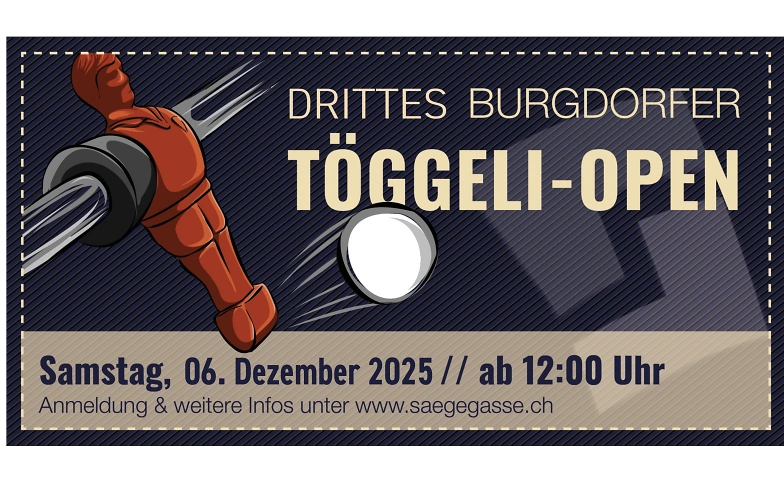 Nach dem grossen Erfolg der ersten beiden Turniere, gehen wir im 2025 in die dritte Runde. Zeigt euer Können am Töggeli-Kasten und messt euch mit 23 anderen Teams. Dem Sieger winken neben Ruhm und Ehre tolle Preise und die charmante Sägegass-Atmosphäre.