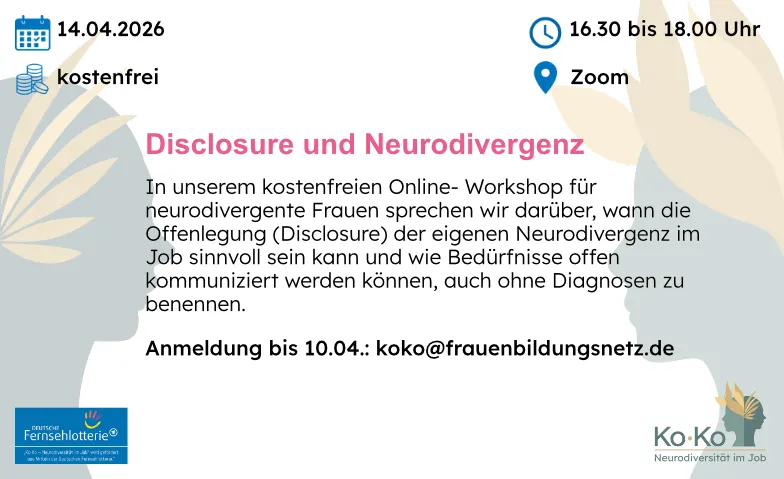 Du bist neurodivergent und unsicher, ob und wie du dich am Arbeitsplatz öffnen und mitteilen kannst? Du fragst dich, ob es bestimmte Informationen gibt, die du teilen musst? Oder du suchst nach Möglichkeiten, deine Bedürfnisse, z.B. nach Anpassungen, zu kommunizieren, auch ohne dabei über Diagnosen zu sprechen? Dann bist du in unserem kostenfreien Online- Workshop genau richtig! Wir gucken uns gemeinsam an, welche Rechte neurodivergente Frauen in Bezug auf Disclosure haben, was für oder gegen eine Offenlegung am Arbeitsplatz oder im Bewerbungsprozess spricht und wie der Ablauf aussehen könnte. Außerdem geben wir Impulse für Entscheidungshilfen, diskutieren gemeinsam Formulierungsmöglichkeiten und blicken auf unterschiedliche Methoden. Freue dich auf eine Mischung aus theoretischem Input und Austausch sowie ausreichend Platz für deine Fragen. Diese Veranstaltung ist für neurodivergente Frauen, die sich in Ausbildung, Studium, Weiterbildung, Arbeit etc. befinden oder auf der Suche danach sind. Für die Teilnahme wird keine offizielle Diagnose benötigt. Wir bemühen uns bei unseren Veranstaltungen um möglichst wenig Barrieren. Für dieses Format werden z.B. Live-Untertitel in Zoom angeboten. Das Einschalten von Kamera und Mikro ist freiwillig und keine Voraussetzung für die Teilnahme.