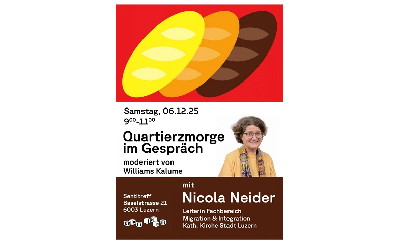 Beim samstäglichen Quartierzmorge tauschen wir uns aus über Gott und die Welt, über Sorgen und Visionen, bei Kaffee und Konfibrot. Man ist hier ein bisschen am Puls des Quartiers, der Gesellschaft. Und ab und zu bittet Williams Kalume Gäste zum Gespräch. So zum Beispiel am 6. Dezember. Da wird Nicola Neider zu Gast sein, Leiterin Fachbereich Migration & Integration bei der Katholischen Kirche Stadt Luzern sowie Gründerin und Präsidentin der Kontakt- und Beratungsstelle für Sans-Papiers Luzern. Die in Berlin geborene Theologin wird uns Einblicke geben in ihre spannende Biographie und in die Freuden und Bürden ihres Engagements in der Zivilgesellschaft.