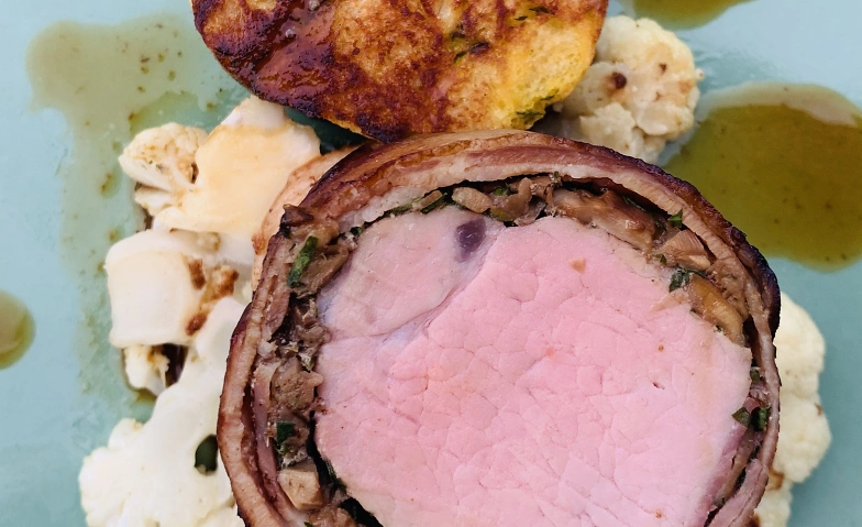 Schweinefilet im Speckmantel auf Gemüse mit Kartoffel-Strudel
