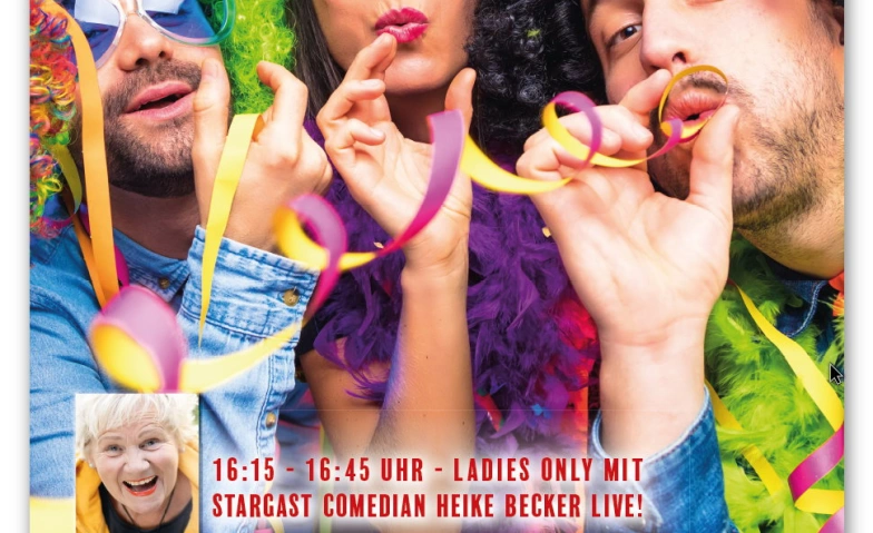 Von 16:15 bis 16:45 Uhr gehört die Bühne ganz den Frauen – dieser Auftritt ist nur für die weiblichen Gäste reserviert. Wichtig: Der Comedy-Auftritt ist ein reines Frauen-Event. Männer feiern in dieser Zeit gemütlich im Bistro weiter. Freut euch auf Comedian Heike Becker aus Dinslaken, bekannt durch den „Thekentratsch“, live und direkt.