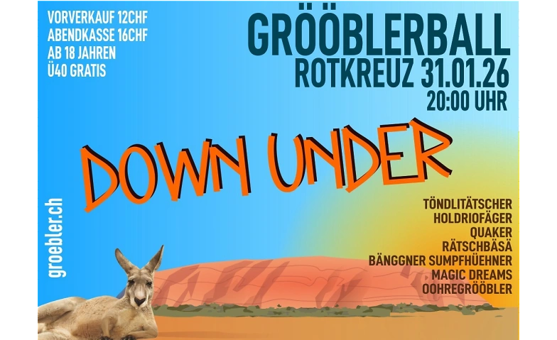 Am Samstag, 31. Januar 2026, laden wir dich nach Rotkreuz ein, um die Fasnacht im unverwechselbaren Grööblerstyle zu feiern. Unter dem Motto Australien verwandeln wir die Nacht in ein exotisches Erlebnis voller Outback-Vibes, Campfire-Feeling und Partylaune bis in die frühen Morgenstunden des 1. Februar.