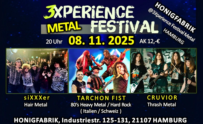 Am 08.11.2025 gibt es hochkarätigen Hair & Glam Metal, 80's Heavy Metal & Hard Rock und Thrash Metal in der Halle der Honigfabrik, Industriestr. 125-131, 21107 Hamburg-Wilhelmsburg: Die Bands siXXXer, TARCHON FIST (Italien / Schweiz) und CRUVIOR werden Euch mit pulsierender Metal-Energie auf dem 3Xperience Festival Metal zum Abfeiern, Mitsingen, Mitrocken und Headbangen bringen! Einlass ist ab 19:30 Uhr, Show-Beginn um 20:00 Uhr!