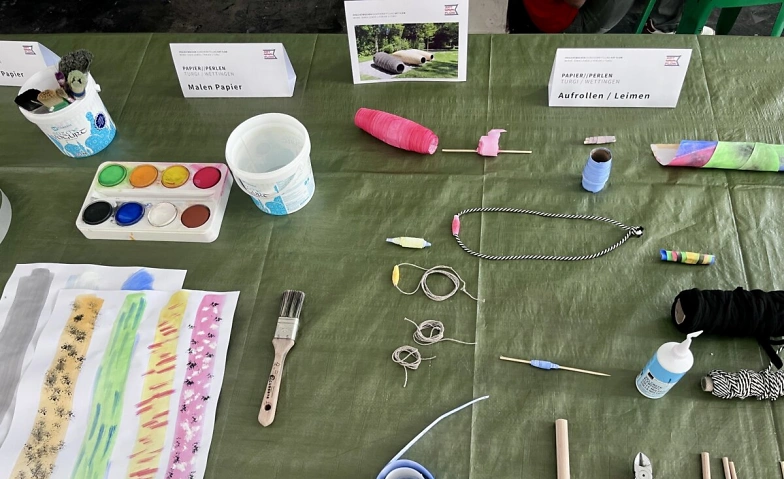 Anschlies­send lassen wir uns von der Skulp­tur anre­gen und werden selbst gestal­te­risch aktiv: Aus hand­ge­fer­tig­ten Papier­per­len ent­ste­hen kleine Skulp­tu­ren und Schmuck­stü­cke – indi­vi­du­ell und ein­zig­ar­tig. Für Kinder ab 5 Jahren, Teil­nahme kos­ten­los.