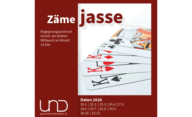 Am letzten Mittwoch im Monat, von 19.00 bis 22.00 Uhr, treffen wir uns im Begegnungszentrum Höchhus zum gemeinsamen Jassen – offen, unkompliziert und für alle geeignet. Vorwissen ist nicht nötig: Du kannst das Jassen neu lernen, alte Kenntnisse auffrischen oder einfach einen gemütlichen Spielabend geniessen.