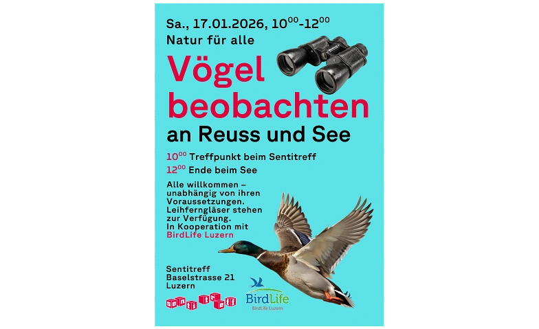 Gemeinsam entdecken wir die Natur und kommen miteinander ins Gespräch. Zwischen Fluss, See und Stadt nehmen wir uns Zeit, beobachten Vögel und erleben Natur dort, wo sie Teil des Alltags ist. Alle Menschen sind willkommen – unabhängig von ihren Voraussetzungen. Leihferngläser stehen zur Verfügung. Geleitet von BirdLife Luzern. Treffpunkt 10 Uhr im Sentitreff. Wer möchte, kann auch schon um 9 Uhr ins Quartierfrühstück kommen.