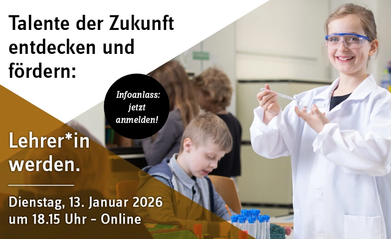Online-Infoveranstaltung der PH Luzern am Dienstag, 13. Januar 2026 um 18.15 Uhr: Lehrerin, Lehrer werden – ein sinnstiftendes Berufsfeld mit tollen Perspektiven kennerlernen.
