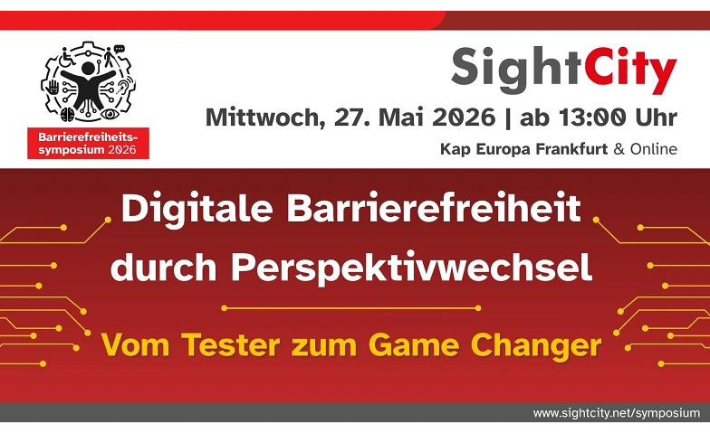 Das Bild zeigt ein Werbeplakat für eine Veranstaltung namens "Sight City Barrierefreiheitssymposium 2026". Es enthält den Titel, das Datum, den Veranstaltungsort und ein Symbol, das verschiedene Piktogramme wie Rollstuhl, Augen und Hände zeigt. Insgesamt vermittelt das Bild den Eindruck einer Konferenz, die sich mit digitaler Barrierefreiheit und der Perspektive von "Testern zu Game Changern" befasst.