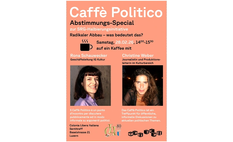 Gesprächsrunde zur eidgenössischen Volksabstimmung vom 8. März über die Volksinitiative "200 Franken sind genug! (SRG-Initiative)". Radikaler Abbau - was bedeutet das? Wir sprechen über die Auswirkungen und darüber, was die SRG für die Schweiz, die Demokratie und die Menschen bedeutet. Mit Rona Schauwecker, Geschäftsleiterin der IG Kultur, und Christine Weber, Journalistin und Produktionsleiterin im Kulturbereich. Das Caffè Politico ist ein Treffpunkt für öffentliche, informelle Diskussionen zu aktuellen politischen Themen.