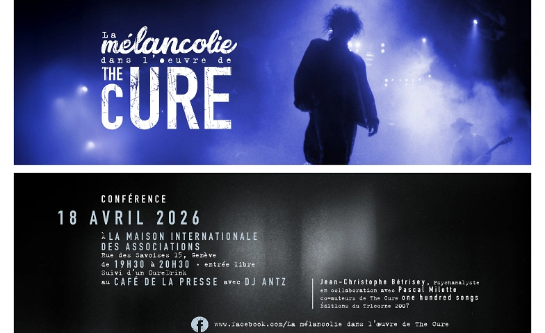 Cette conférence, co-réalisée avec le Québécois Pascal Milette, propose une immersion dans l’univers artistique et psychologique du groupe The Cure, à travers l’analyse de ses textes, des références littéraires de Robert Smith, des grands thèmes qui traversent ses chansons, ainsi qu’une lecture psychanalytique du titre Just Like Heaven. La rencontre sera illustrée par des projections de photos, de textes et d’anecdotes inédites, et sera suivie d’une soirée avec DJ Antz au Café de la Presse.