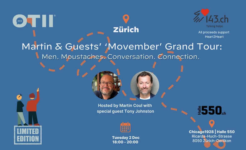 This Movember, Martin Coul brings his Grand Tour to Zürich for an evening of open dialogue on men’s mental health. Drawing on his own lived experiences, he focuses on tackling the conversations many shy away from, helping organisations and individuals address the root causes of poor well-being across all stages of life. He is also the host of The Hushed®, a podcast about men, stories, and what we don’t always say.