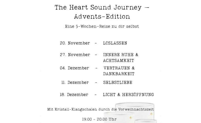 Über 5 Wochen begleite ich dich durch die Adventszeit - mit den Klängen und Frequenzen von  sieben Kristall-Klangschalen, die dich sanft zurückführen zu dir selbst - deinem Herzen, deinem inneren Licht und der Stille in dir.