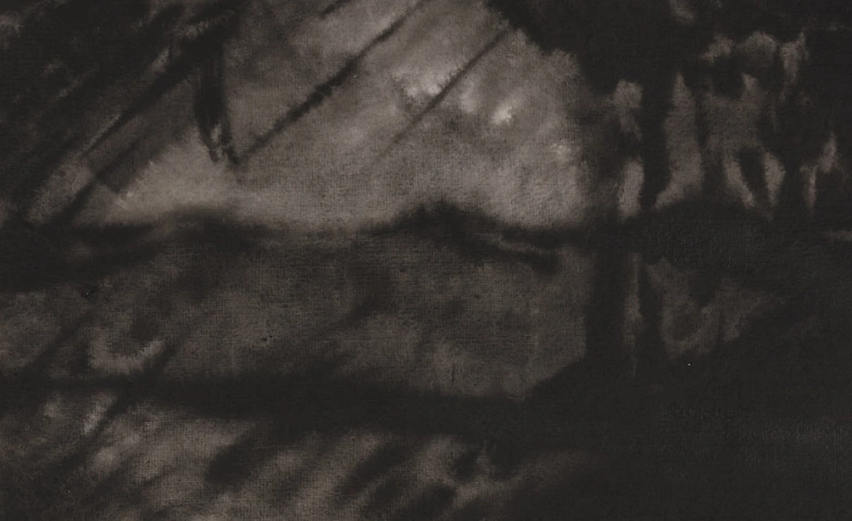 Ein kalter, böiger Wind aus dem Norden, der über die Berge hinweg in den Mittelmeerraum einströmt. Diese Bewegung bildet die Ausgangslage für eine Serie von Tuscharbeiten auf Bütten und Leinen, die ungerahmt und in beinahe nomadischer Schlichtheit im schwarzen Galerieraum gezeigt werden. Den Bildern liegen experimentelle Fotografien zugrunde, die während einer Reise über den Apennin entstanden: «ausgehend vom Fahrzeug als Basisstation, suchte ich abgelegene Orte auf – Landschaftszonen, in denen Stille, Wind, Wasser und Stein zu den einzigen Begleitern werden.» Die Kamera dient dabei nicht der Landschaftsdarstellung. Mit Spiegeln und Linsen sammelt er Licht aus verschiedenen Himmelsrichtungen und lenkt es ohne Objektiv ins Dunkel. Aus einem zunächst überblendeten Weiss entstehen schattenhafte Überlagerungen, Strukturen und Konturen – ein subjektiver Bildraum.