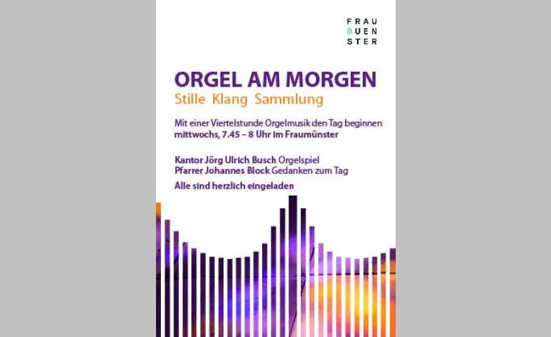 mittwochs, 7.45 – 8 Uhr im Fraumünster Ensemble: Mit einer Viertelstunde Orgelmusik den Tag beginnen Leitung: Kantor Jörg Ulrich Busch Orgelspiel Pfarrer Johannes Block Gedanken zum Tag Solist: Alle sind herzlich eingeladen