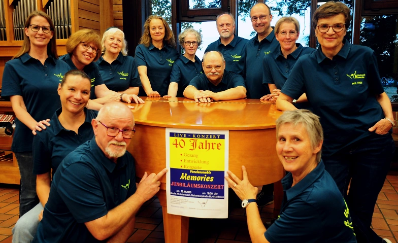Das Vocalensemble Memories feiert am Sonntag, 19. Oktober, um 16:30 Uhr (Einlass 16:00) in der evangelischen Kirche am Heierbusch in Essen-Bredeney (Meisenburgstr. 80) sein 40-jähriges Bestehen mit einem Festkonzert – und lädt das Publikum zu einem musikalischen Erlebnis der besonderen Art ein. Der Eintritt ist frei, um eine Spende wird gebeten.