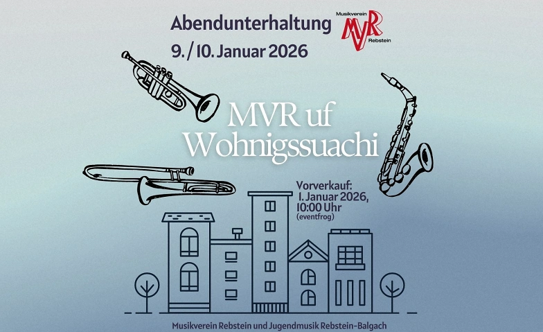 Am 9. und 10. Januar 2026 laden der Musikverein Rebstein und die Jugendmusik Rebstein-Balgach herzlich zur Abendunterhaltung «MVR uf Wohnigssuachi» in die Progyhalle ein! 🎵🎺