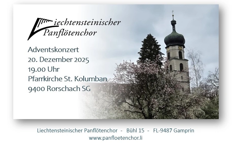 Am Samstag 20. Dezember, um 19:00 Uhr, lädt der Liechtensteinische Panflötenchor zu einem stimmungsvollen Adventskonzert in die Kolumbanskirche in Rorschach ein. Mit seinen abwechslungsreichen Klängen umd warmen Panflötentönen verzaubert der Chor das Publikum und stimmt auf die bevorstehenden Festtage ein.