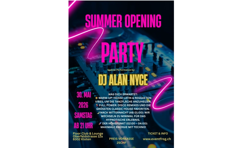 Sommer Opening Party mit DJ ALAN NYCE (Just Music) Floor Club, Oberfeldstrasse 12, 8302 Kloten Tickets