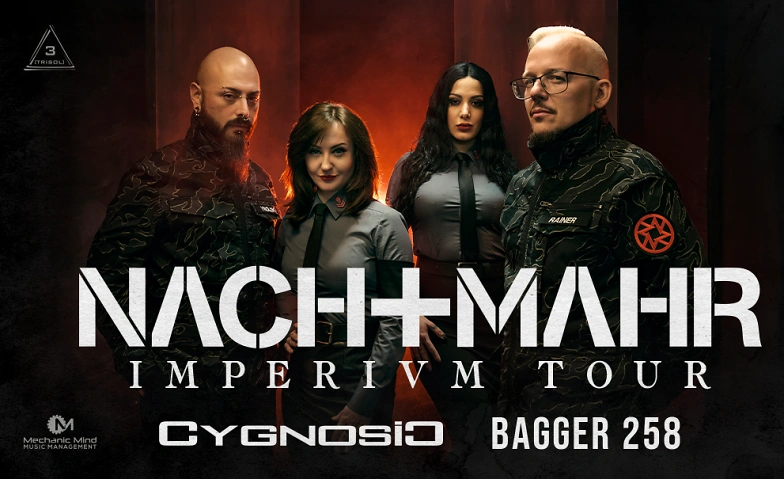 Thomas Raineri st einer der kompromisslosesten Visionäre derschwarz-gefärbten, elektronischen Musiklandschaft.Mit NACHTMAH Retablierte er früh ein Projekt, das brachiale Club-Sounds mitstarken, inhaltlich vielschichtigen Texten verbindet und das Projekt somit über die Jahre zu einemder ganz großen Taktgeber der verheerenden Industrial-Kultur gemacht. Schon mit dem allerersten Lebenszeichen, dem donnernden Dunkeltechno der EP „Kunst ist Krieg“, überschritt er den Rubikon.Seit 2007 hat er elf vernichtende Studioalben, neun EPs und ungezählte, alles versengende Liveshows entfesselt.2026 kehrte rmit IMPERIVM zurück, einem knallharten Werk, das klangliche Dominanz mit Unbeugsamkeit kreuzt und dem Widerstand gegen Schubladendenken und Konformitäteinen Soundtrack aus Stahl und Obsession schenkt. Besonders gut  fließen sich NACHTMAHR Alben immer schon auf der Bühneerleben. Wer dieser Band schon einmal live gegenübergestanden ist, hat sich meist bis heute nicht erholt. Ein NACHTMAHR-Konzert ist keine Promotion-Veranstaltung für ein neues Album. Keine halbgarinszenierte Show mit Retorten-Beats. Sondern ein Gesamtkunstwerkaus Klang, Visuals, Outfits, Lichtund Attitüde. Die fleischgewordene Vision Thomas Rainers, die ultimative Inkarnation seiner Fantasien. Eher reinigendes Ritual als Konzert, Katharsis im mächtigen Gewand des ImperialIndustrial, eine Möglichkeit für das Publikum,so tief wie nie in die Welt Nachtmahrs einzutauchen.Los zulassen. Alles zu vergessen. Sich seinen innersten Dämonen hinzugeben.Denn auch das ist NACHTMAHR: Eine Gemeinschaft, ein Safe Space für die Outsider,für alle die, dienicht in die Normender Gesellschaft passen und jeden Tag Ausgrenzung erleben. Nirgendwo wird das deutlicher als vor der Bühne, wenn Band und Publikum eine verhängnisvolle Liaison eingehen,ein wogendes Meer aus Leibern im Widerschein des zuckenden Strobo Lichts.NACHTMAHRl ive ist kein beliebiges Clubkonzert. Sondern ein seismisches Ereignis. Spürt es selbst–wenn ihr euch traut.Eröffnet werden die Shows der bislang längsten und größten Nachtmahr-Tournee von BAGGER 258 und CYGNOSIC. Während BAGGER 258 für kompromisslosen EBM 2.0 steht und das angestaubte Genre mit einem Presslufthammer von Retro-Wahn befreit, steht das griechische Project CYGNOSIC für einen berauschenden Cocktail als elektronischer Aggression und der Monumentalität des Metal.Beide sind auf den Bühnen zuhause, beide werden diesen Mahlstrom aus harten Beats, obsessivenShoweinlagen und elektronischer Eskalation gebührend einleiten.