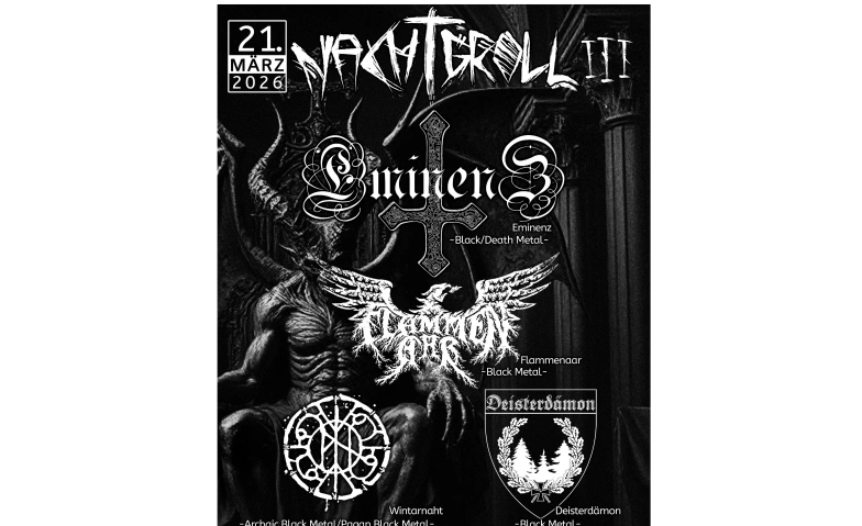 #NACHTGROLLIII #BlackMetal #Staupitz #HildesTanzbar #Eminenz #Wintarnaht #Deisterdämon #Flammenaar #GermanBlackMetal #Metal #ExtremeMusic #LiveMusic #MetalConcert #UndergroundMetal #SupportYourLocalScene #Nachtgroll2026