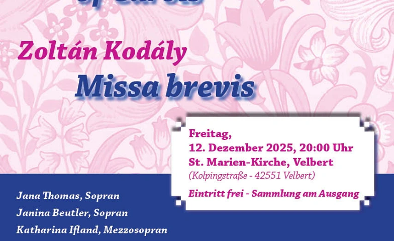 Das Konzert findet statt am Freitag, 12. Dezember 2025 um 20:00 Uhr in der Kirche St. Marien, Kolpingstraße, 42551 Velbert. Der Eintritt zum Konzert ist frei, am Ausgang gibt es eine Sammlung.