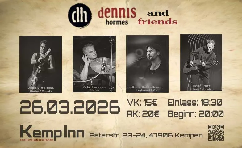 Dennis Hormes and Friends. Nach den letzten tollen Auftritten in der Butze wird Dennis Hormes and Friends auch regelmäßig Gast im Kemp Inn sein. Am 26.03.2026 wird es dann zum ersten Mal im Kemp Inn neue Songs auf die Ohren geben. Lasst euch überraschen.