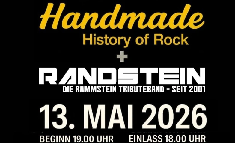 Erlebt einen Abend voller Gitarrenpower: Handmade führt euch durch die „History of Rock“, anschließend zündet RANDSTEIN – die Rammstein-Tributeband (seit 2001) – die nächste Stufe. Der gesamte Erlös kommt einem guten Zweck zugute.