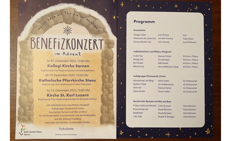 Der Jodlerklub Echo vom Pilatus Hergiswil, die Geschwister Rymann mit Rita am Bass und die Jodelgruppe Chriensertal Kriens singen in der Kollegi Kirche Sarnen, Pfarrkirche Stans und in der Kirche St. Karl Luzern. 3 Benefizkonzerte für das Kinderspital, die Kinderspitex und die Stiftung Theodora zugunsten des kranken, krebskranken Kindes.
