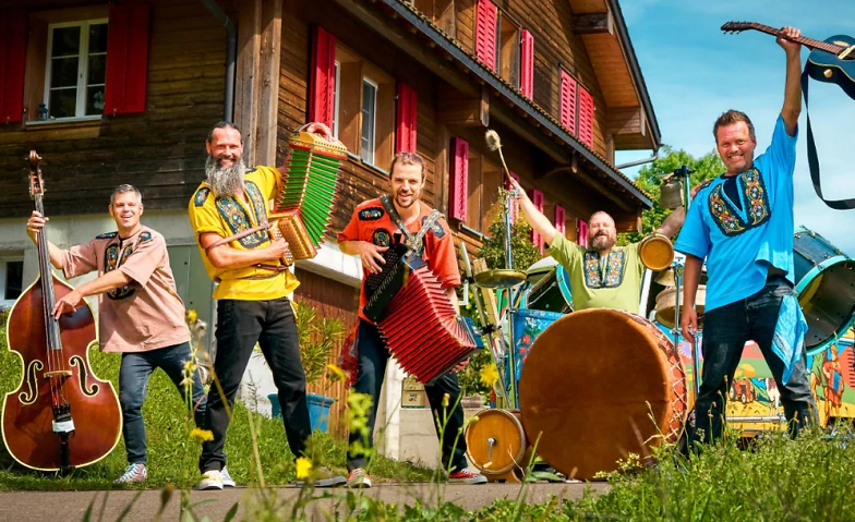 Urs Fischer jun., bekannt als dr Eidgenoss, Adamo Häller, Akkordeon-Virtuose (Trauffer, ChueLee), und Schibä, die markante Stimme von Äxtra und QL – gemeinsam liefern wir Volksmusik mit Herz, Witz und jeder Menge Druck auf der Bassdrum.