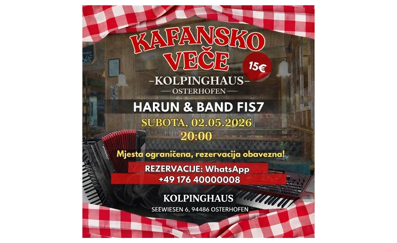Za vas organizujemo, 02.05.2026, muzicko vece na nas nacin. . Zelimo vam u ovoj veceri pribliziti, uz ambijent i muziku, mozda vec zaboravljeni duh i osjecaj jedne KAFANSKE NOCI. Uz nasu uslugu ce vas zabaviti Harun Fazilhodzic sa pratnjom benda FIS7. Uzivajte u ovoj noci uz muzicki repertoar vama poznatih kafanskih hitova.