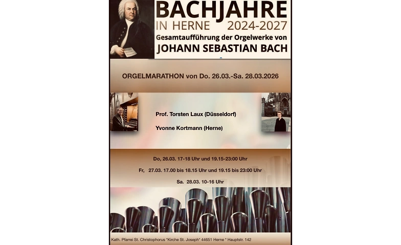 Der renommierte Konzertorganist und Hochschullehrer Prof. Torsten Laux und die Herner Konzertorganistin Yvonne Kortmann spielen am Donnerstag, 26.03. und Freitag, 27.03. jeweils in der Zeit von 17 bis 23 Uhr mit zwischenzeitlichen kleinen Pausen (eine größere Pause findet immer in der Zeit von ca. 18.15 Uhr bis 19.15 Uhr aufgrund von Messen statt) sowie am Samstag, 28.03. von 10 bis 16 Uhr das gesamte Orgelwerk von Johann Sebastian Bach in der Kirche St. Joseph (Löwenkirche) zu Herne-Wanne. In jeweils 14 Konzerten interpretieren sie einmal durch das Kirchenjahr hindurch diese beeindruckenden Werke. Von schlichten Choralbearbeitungen über filigrane Fugen, prächtige Präludien und Trios der höchsten Kompositionskunst wird der Zuhörer eingeladen die beeindruckende Vielfalt der bach'schen Orgelmusik zu erleben.