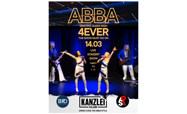 The night begins with a spectacular live performance by a Swiss ABBA tribute group, performing the full ABBA repertoire — iconic hits, powerful vocals and a big, energetic stage show.