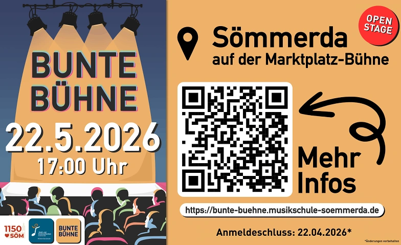 Die Bunte Bühne Sömmerda ist eine Open Stage für Künstlerinnen und Künstler aus der Region und findet im Rahmen der 1150-Jahr-Feier der Stadt Sömmerda statt. Die Veranstaltung bietet eine offene Plattform für kreative Beiträge aller Art – egal ob Musik, Gesang, Tanz, Theater, Poetry, Comedy oder etwas ganz anderes. Ziel ist es, Menschen zusammenzubringen, Talente sichtbar zu machen und gemeinsam einen abwechslungsreichen Abend zu gestalten.