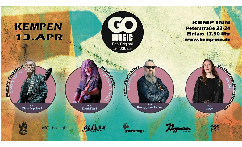 Diesmal steht alles im Zeichen der 70er. Songs, die Geschichte geschrieben haben. Melodien, die Generationen verbinden. Grooves, die sofort in die Beine gehen. Für frischen Wind sorgt eine Premiere: Mit Katharina Kirschsiefen steht erstmals eine neue Schlagzeugerin auf der GO MUSIC Bühne. Die Kölnerin, bekannt durch ihre Energie in der BAP-Tribute-Band MAM, bringt Power, Präzision und eine ordentliche Portion Spielfreude mit. Ihr Groove ist direkt, ehrlich und absolut tanzbar. Ein weiteres Highlight: Jens Skwirblies reist mit einer echten Hammond-Orgel samt Leslie-Cabinet an – ja, genau so, wie man es aus den großen 70er Produktionen kennt. Wenn sich der warme, rotierende Sound im Raum ausbreitet, fühlt man sich sofort in eine andere Zeit versetzt. Jens ist unter anderem als Organist bei Barclay James Harvest sowie bei der MAGIC OF SANTANA Show aktiv und weiß genau, wie man diesen legendären Sound zelebriert. Für internationales Flair sorgt Bryn Jones. Der Brite, der in Finnland lebt und dort mit seiner Band Ban Drink Floyd große Erfolge feiert, bringt genau die Mischung aus britischem Rock-Charme und emotionaler Intensität mit, die dieses Programm braucht. Seine Stimme trägt – kraftvoll, warm und authentisch.