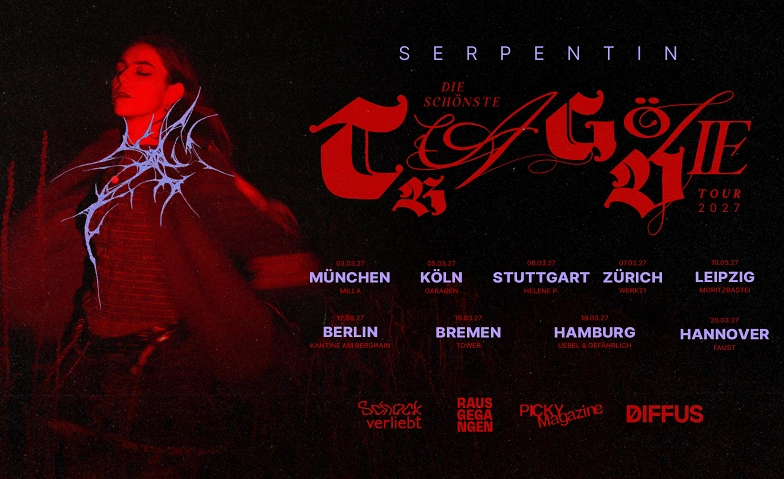 Nach der erfolgreichen „Blutrote Sonne“-Tour kehrt Serpentin im Frühjahr 2027 mit neuer Musik und neuer Wucht zurück. Mit der „Die schönste Tragödie“-Tour führt sie ihr Publikum tiefer in ihren Klangkosmos – dorthin, wo Stärke und Verletzlichkeit einander begegnen.