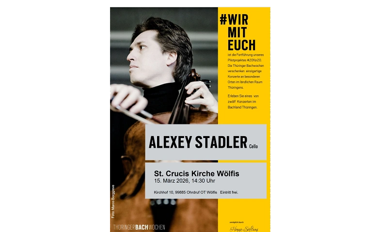 In einer besonderen Kooperationsveranstaltung der Thüringer Bachwochen präsentiert der renommierte Cellist Prof. Alexey Stadler als Artist in Residence der Thüringer Philharmonie Gotha-Eisenach ein Benefizkonzert im Rahmen des Projekts #WIRMITEUCH. Am Ort der historischen St. Crucis Kirche zu Wölfis lädt das Konzertprojekt dazu ein, die Restaurierung der Ratzmann-Orgel zu unterstützen – und das ganz im Zeichen der Bachmusik sowie weiterer Meisterwerke.