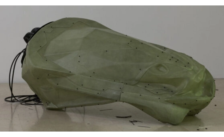 Des Künstlers skulpturale Arbeiten tragen diese atmosphärische Spannung in sich, durch ihre außergewöhnliche Ästhetik und Formgebung: Sie sind reizvoll und unheimlich zugleich, sie wirken abschreckend und schön, tot, ausgeschlachtet, vom Strom genommen und doch tragen sie das Potenzial des Lebendigen in sich. Sie nehmen eine Präsenz zwischen starrem Objekt, hochkomplexer Maschine und natürlichem Organismus an und verweisen so auf eine unsichtbare menschliche Existenz, deren wir uns durch unsere eigene Beobachtung auf unheimliche Weise bewusst werden.