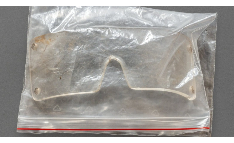 Eine Schutzbrille aus Plexiglas steht am Anfang der Ausstellung "Eingestellte Gegenwarten" von Franz Wanner (*1975, Bad Tölz). Die Brille wurde bei Grabungen auf dem Gelände des ehemaligen Konzentrationslagers Sachsenhausen geborgen. Über die inhaftierte Person, die zur Zwangsarbeit in der Rüstungsindustrie eingesetzt war und mit der Brille ihr Augenlicht schützte, gibt es bislang keine auffindbaren Informationen. Ihr Wunsch sich zu schützen, zeigt sich bis heute an diesem Objekt.