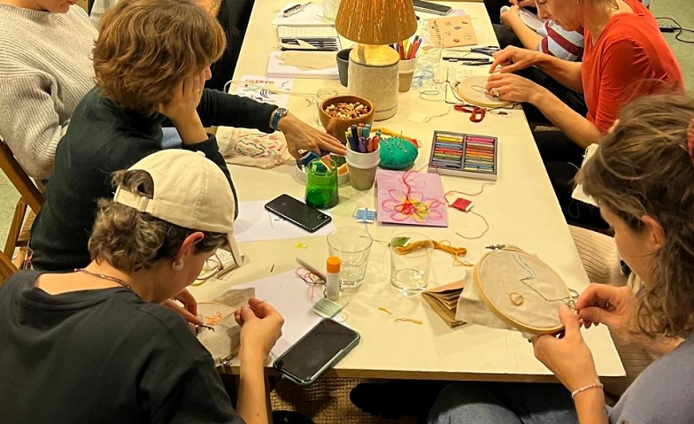 Then we move to a collective embroidery table. In a relaxed, open setting, you’re invited to create your own small embroidered piece — or simply explore the materials at your own pace. No experience is needed, and all materials are provided. The space is open and gently held, without formal instruction or pressure to make anything «right».