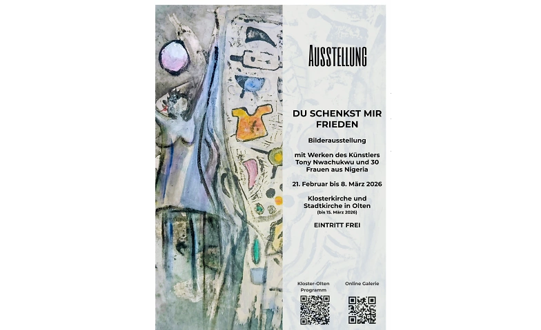 Das Werk vom nigerianischen Künstler Tony Nwachukwu und 30 Frauen aus dem Süden des Landes ist vom 21.2. - 8.3. // 15.3.26 in Kloster und Stadtkirche Olten zu Gast. Anlass ist der Weltgebetstag 2026 (WGT - Gastgeberland Nigeria). Die Frauen haben unter der Leitung des Künstlers und zum Motto des WGT "Ich will dich stärken. Komm bring mir deine Last" eigene Werke gestaltet.