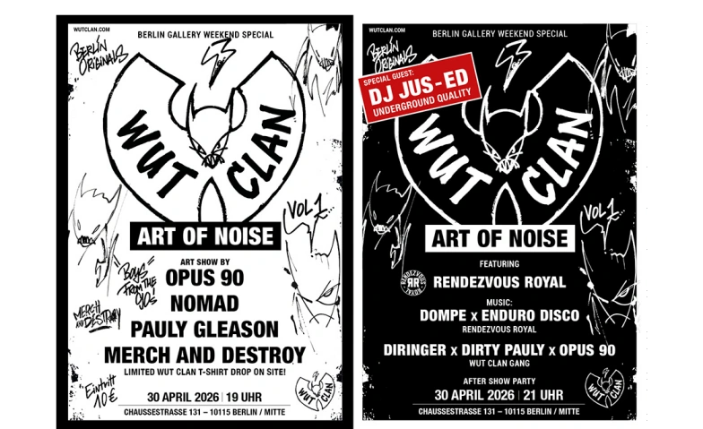 Zum Auftakt des Berlin Gallery Weekend 2026 präsentiert das Berliner Künstlerkollektiv WUT CLAN — Term Shon (OPUS 90) und Pauly Gleason (Dirty Pauly) — seine erste Ausstellung und Clubnacht ART OF NOISE …ist mehr als eine Ausstellung — es ist eine Kollision von Bild, Klang und Subkultur. Die Schau zeichnet die visuelle und akustische Sprache nach, die im „Goldenen Zeitalter“ Berlins (1989–2000) entstanden ist — geprägt von Freiräumen, frühem Techno und einer radikalen DIY-Haltung. Gezeigt werden Positionen von Künstlern, die in dieser Zeit sozialisiert wurden und deren Intensität in eine zeitgenössische Form übersetzen — roh, unmittelbar und kompromisslos physisch. Die Arbeiten wirken weniger wie Objekte als vielmehr wie Frequenzen: unruhig, verzerrt und lebendig.