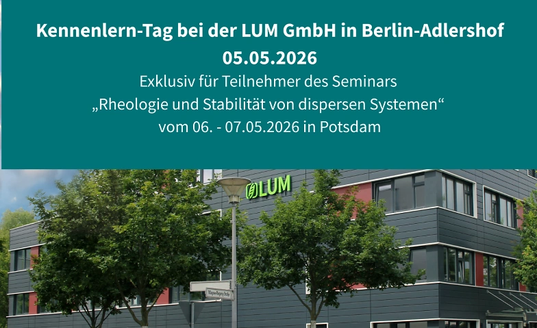 Der Kennenlern-Tag ist exklusiv für Teilnehmer des Kooperationsseminars "Rheologie und Stabilität von dispersen Systemen" in Potsdam vom 06.05.2026 - 07.05.2026 reserviert. Bitte die Anmeldebestätigung an event@lum-gmbh.de senden.