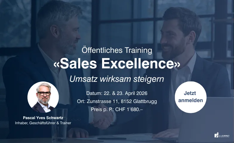 Das Bestseller-Training «Sales Excellence» richtet sich an Sales-Profis (und die, die es werden wollen), die Entscheidungsprozesse souverän meistern wollen. Du erhältst fundierte Methoden und praxisnahe Werkzeuge zur Optimierung deiner Verkaufstechnik. Du trainierst, das Kundenbedürfnisse umfassend zu erfassen, das IMPACT-Modell® zur Kaufmotiv-Analyse zu nutzen und deine Abschlussquote durch wirkungsvolle Verhandlungstechniken zu steigern – für einen höheren Umsatz.