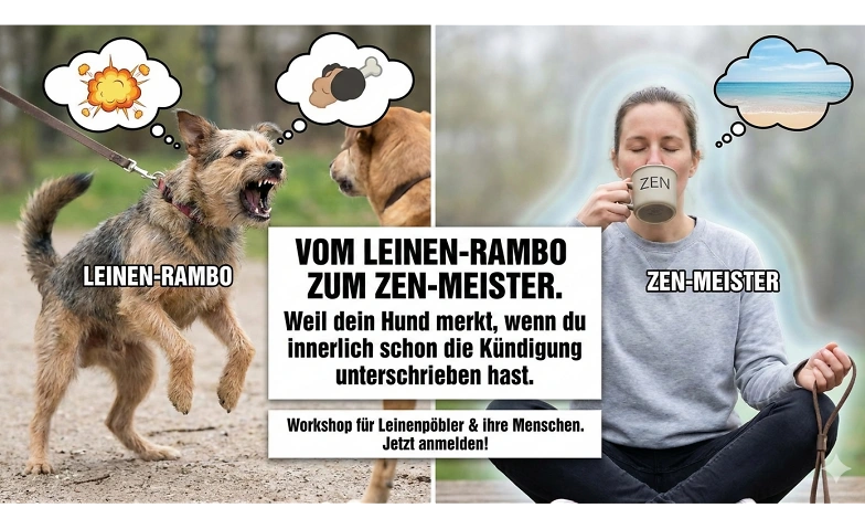 Die Lösung: In unserem Workshop lernen wir, warum dein Hund denkt, er müsste den Türsteher für dich spielen, sobald dein Puls auf 180 geht. Wenn du innerlich schon die Kündigung für dein Nervensystem unterschrieben hast, wird dein Hund sicher nicht den Yoga-Lehrer mimen. Wir arbeiten daran, dass du am Ende der Leine nicht mehr wie ein vibrierendes Nokia-Handy aus den 2000ern wirkst, sondern wie der Fels der Ruhe und Gelassenheit, an dem das Chaos einfach abprallt.