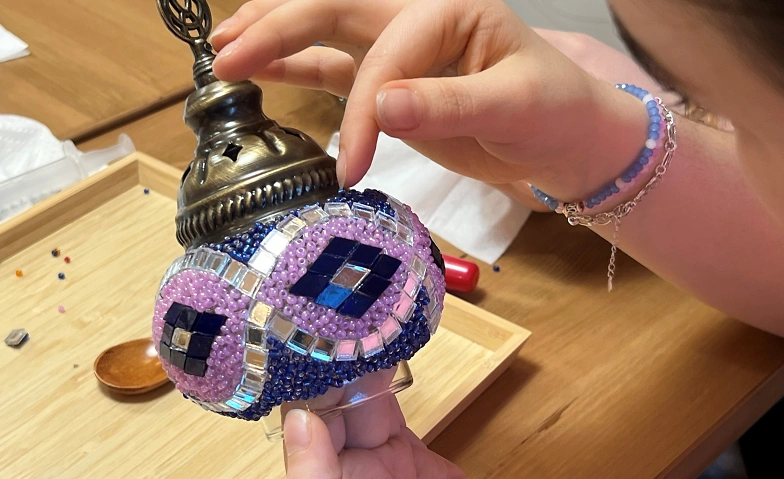 „In diesem Workshop konnte ich für ein paar Stunden abtauchen und den Alltag vergessen. Die Instruktionen waren klar und einfach umsetzbar. Auch die Geschichte der türkischen Mosaikkunst hat mir sehr gefallen. Meine Mosaiklampe werde ich neben meinem Bett aufstellen.“ – Julia