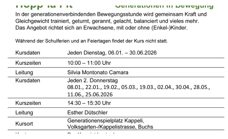 Generationenverbindendes Bewegungstraining Zentrum Buchs, Bahnhofstrasse, 9470 Buchs SG Tickets
