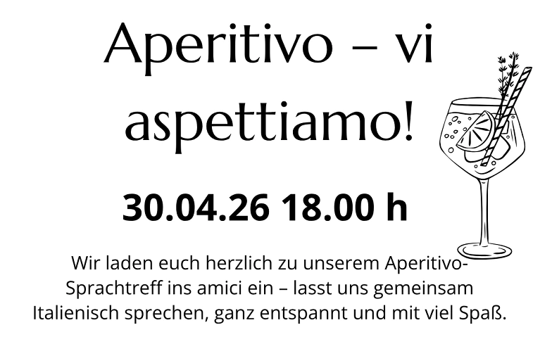 Wir laden euch herzlich zu unserem Aperitivo-Sprachtreff ins amici ein – lasst uns gemeinsam Italienisch sprechen, ganz entspannt und mit viel Spaß.