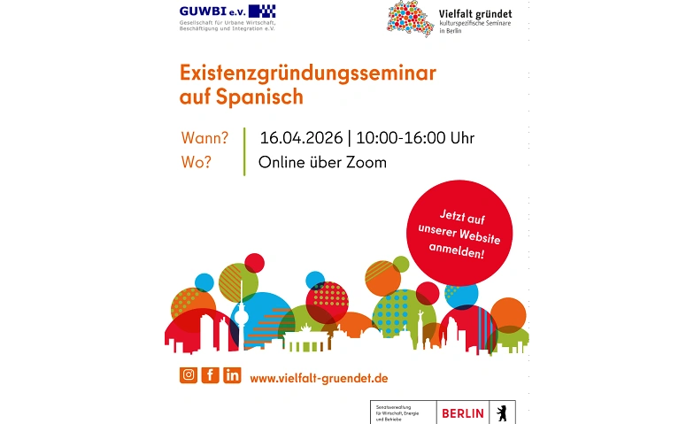 Dann melden Sie sich für unser kulturspezifisches Online-Orientierungsseminar auf Deutsch und Spanisch an! An einem Tag bekommen Sie die wichtigsten Informationen zum Thema Gründung und werden persönlich und kompetent beraten.