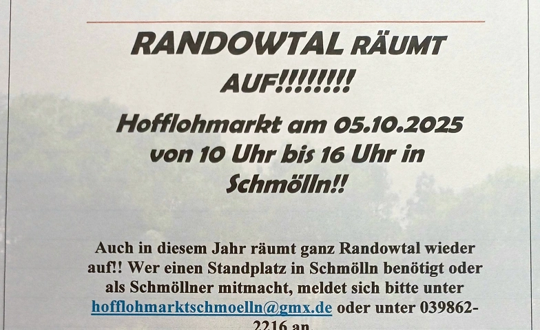 Auch in diesem Jahr räumt ganz Randowtal wieder auf!! Wer einen Standplatz in Schmölln benötigt oder als Schmöllner mitmacht, meldet sich bitte unter hofflohmarktschmoelln@gmx.de oder unter 039862-2216 an.